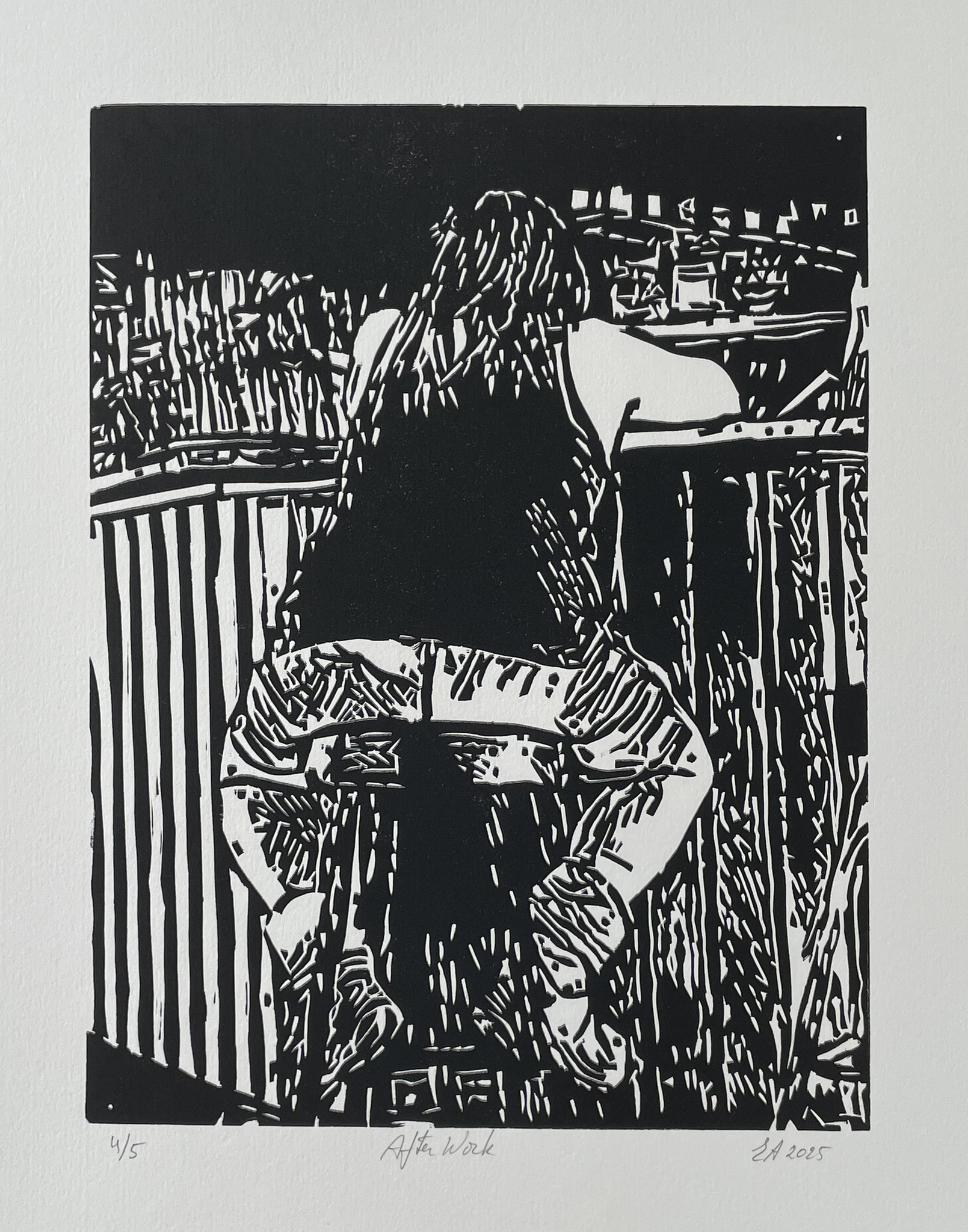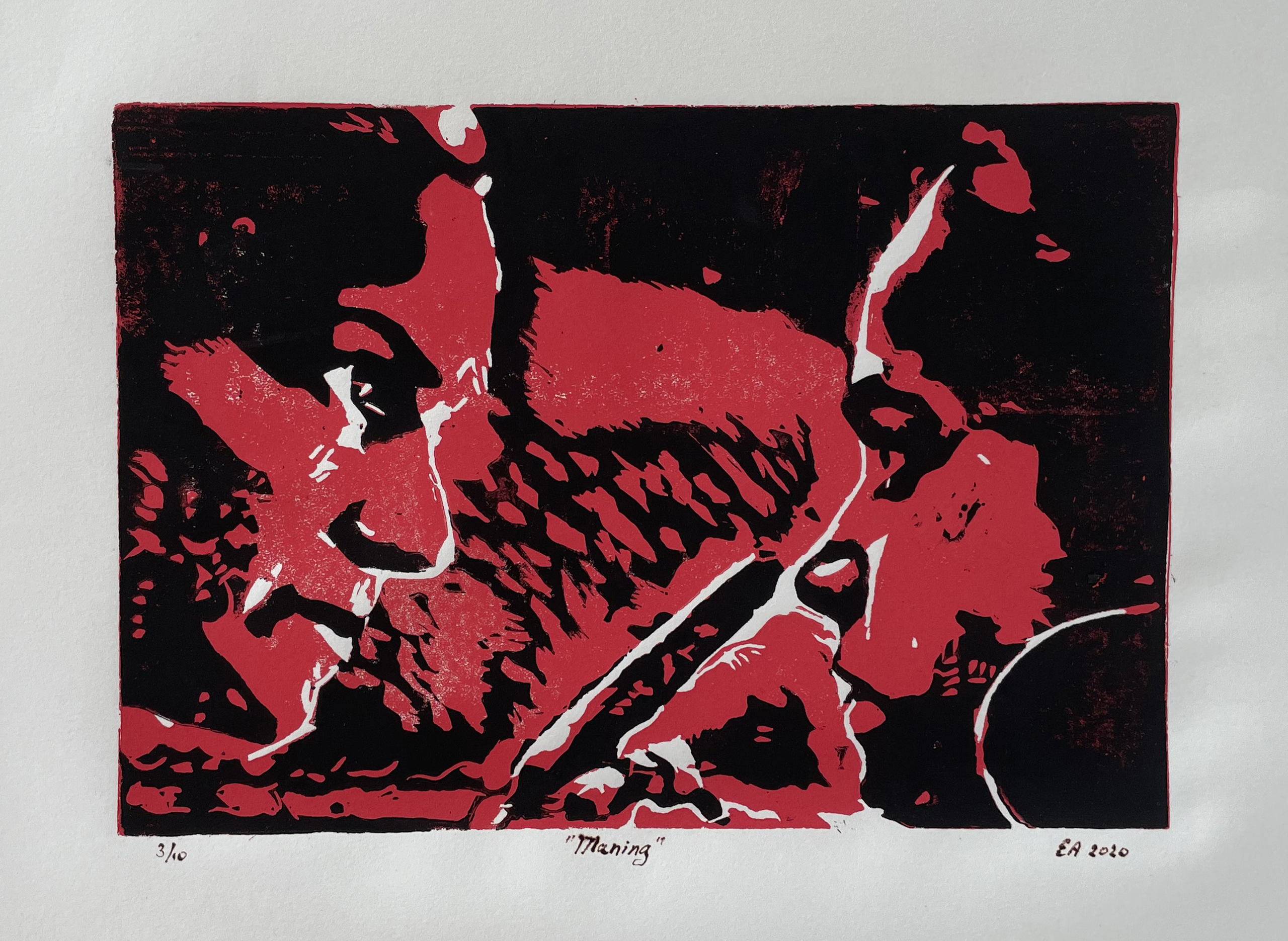 Linodruk geïnspireerd op een dansvoorstelling (Conny Janssen Danst) gezien in de Deventer schouwburg.