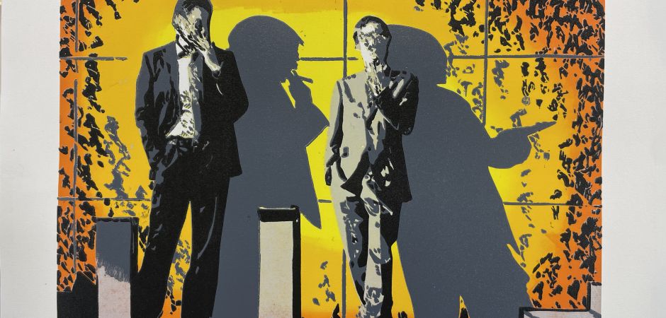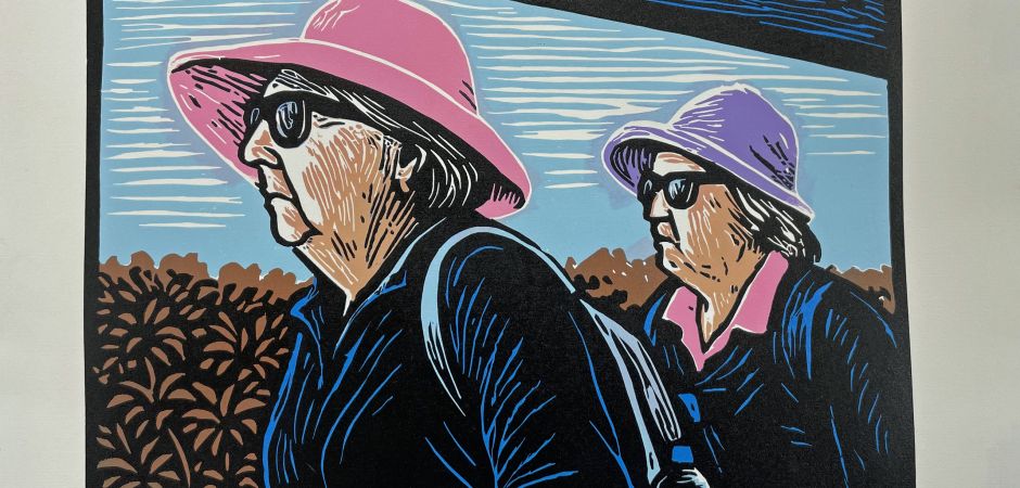 Lino in geel, oranje en zwart van een vrouw en een man zittend in een slaapkamer.