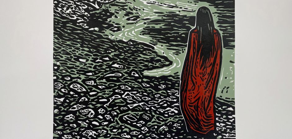 Minimalistische weergave van een zittende vrouw voor een landschap.