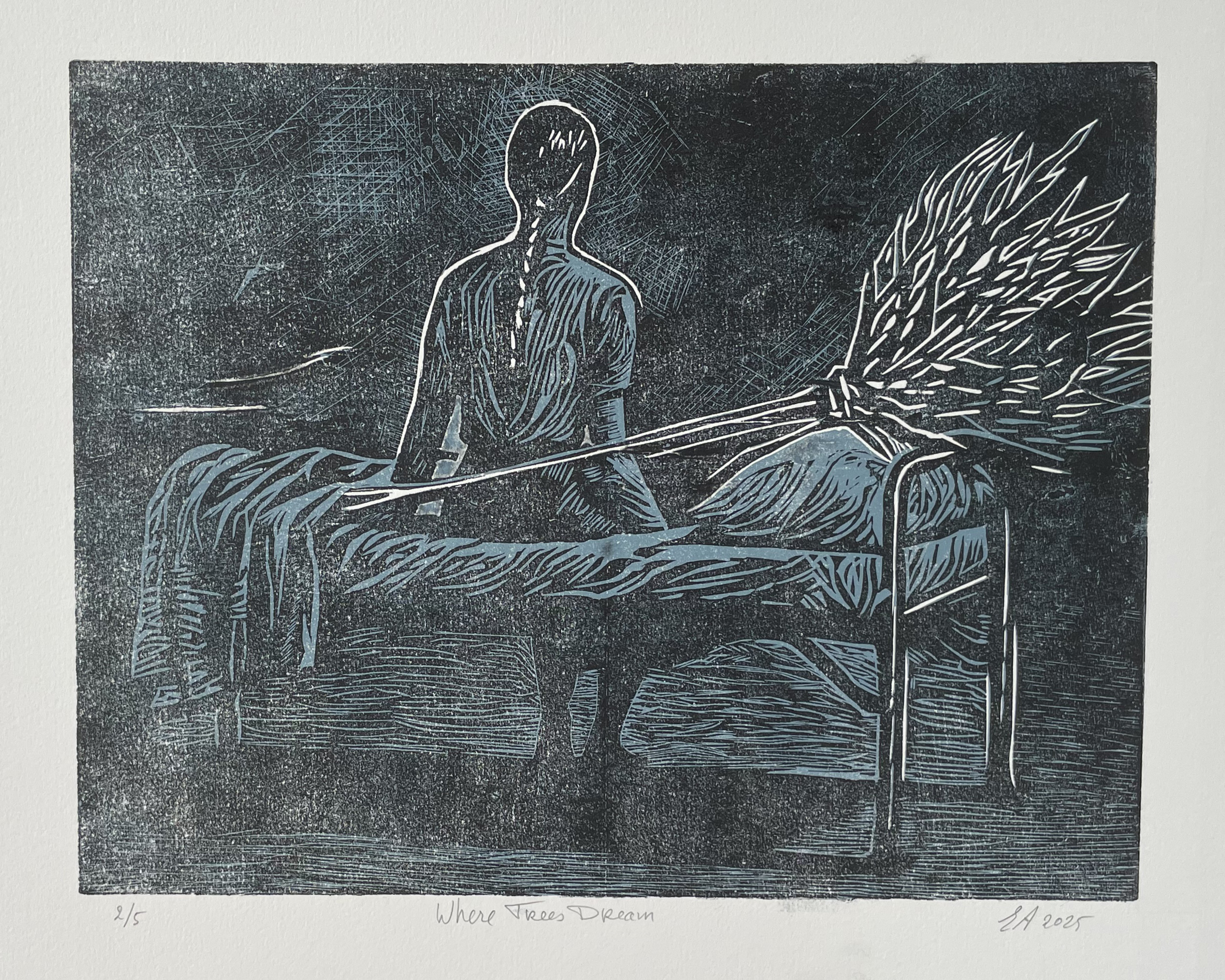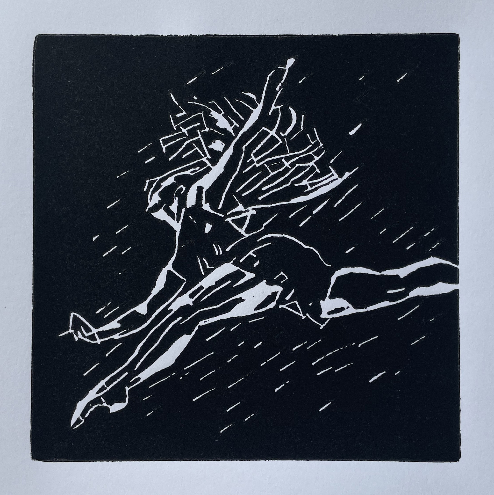 Linodruk geïnspireerd op een dansvoorstelling (Conny Janssen Danst) gezien in de Deventer schouwburg.