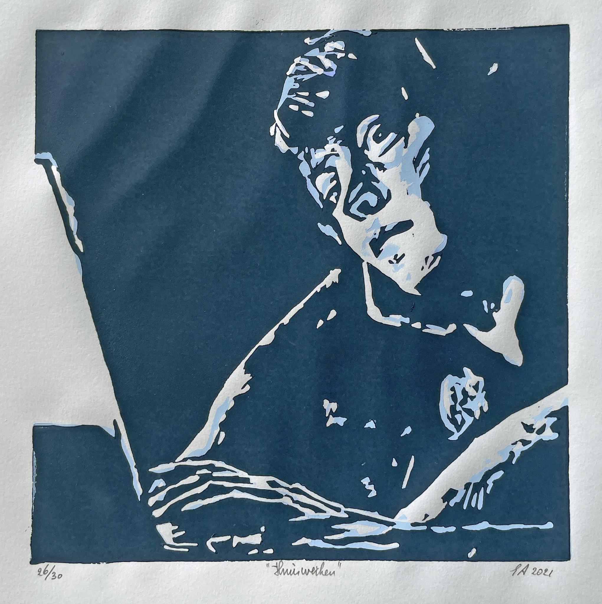 Portret van een observerende vrouw. Linodruk in blauw en wit.