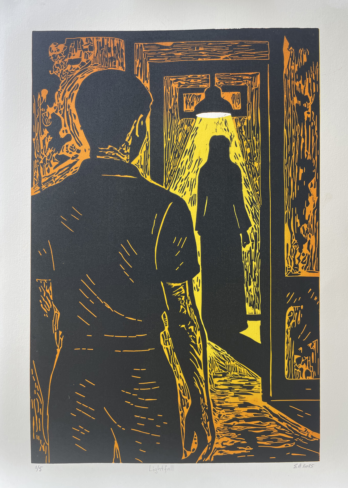 Lino in geel, oranje en zwart van een vrouw en een man zittend in een slaapkamer.